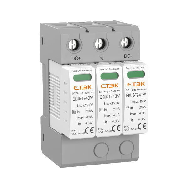 EKU5-T2直流電涌保護器適用于額定電壓DC600?1500V太陽能光伏發電系統或其他直流電源系統的防雷及過電壓保護。滿足II類(8/20μs波形)電涌保護器(SPD)試驗,用于抑制瞬態過電壓低于設備耐沖擊過電壓,泄放電涌能量,從而保護系統電路及設備,針對光伏系統設備保護設計U、Y型結構。